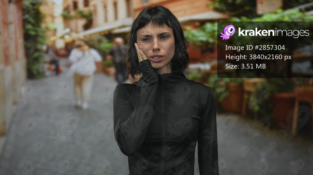 Woman in black casual jacket holds cheek with hand on busy urban street for toothache; discomfort.