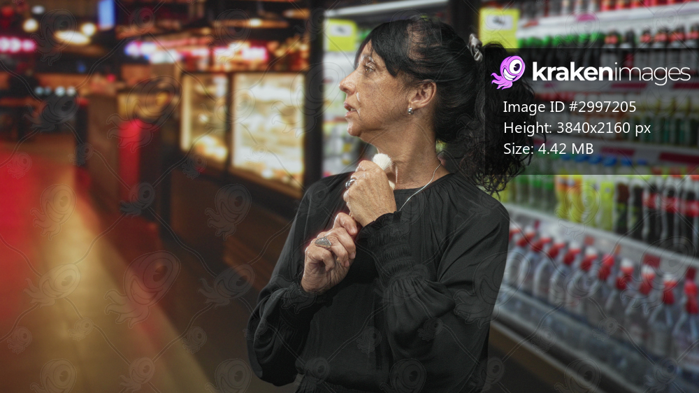 Woman in black dress dabs brush to cheek and holds multiple makeup brushes in supermarket aisle near shelves of bottled drinks; quiet contemplation.