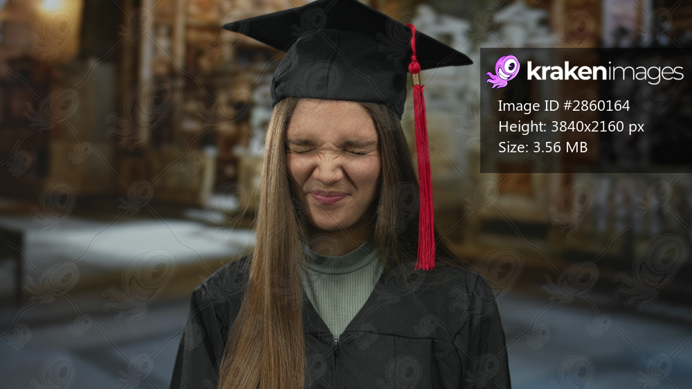 Woman in black graduation gown and mortarboard with red tassel grimaces in ornate catholic church; unease.
