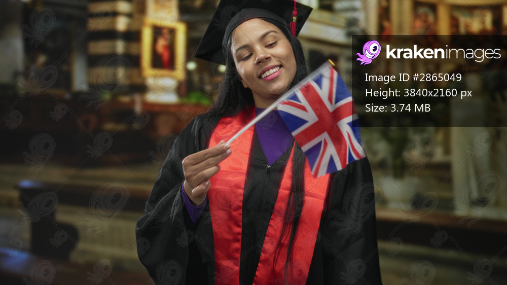 Woman in black graduation gown and mortarboard waves union jack flag in historic church building; pride success celebration milestone.