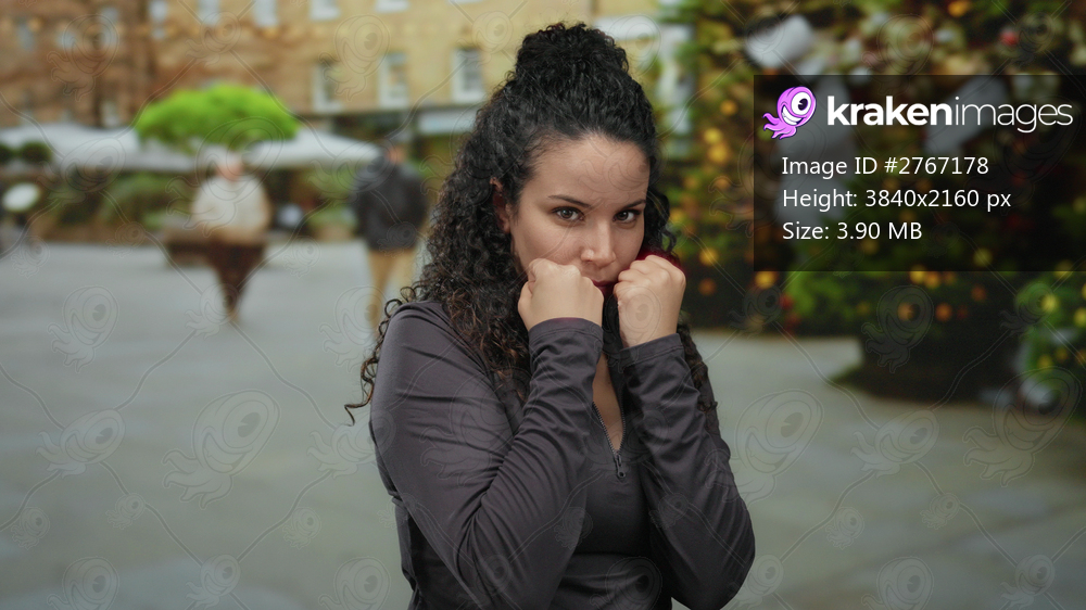 Woman in black hoodie playfully posing in street decorated with festive outdoor lights showcasing vibrant holiday spirit.