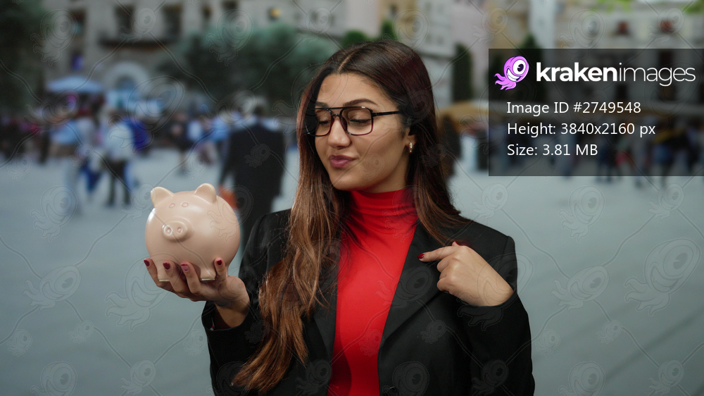 Woman in black jacket and red shirt holding piggy bank on busy street, gesturing confidently, symbolizing financial planning and independence in an urban outdoor setting. - Kraken Images
