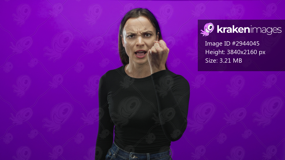 Woman in black long sleeve top and jeans beckons with curled hand and furrowed brow toward camera in studio with purple backdrop; anger defiance.