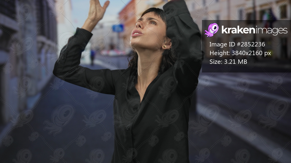 Woman in black shirt holds hands to head and looks upward on historic street; anxiety tension inner turmoil dread.