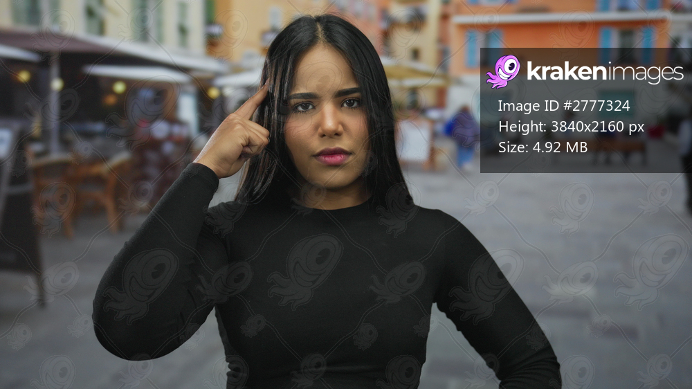 Woman in black shirt pointing and thinking on an outdoor street with blurred background of colorful buildings and people walking.