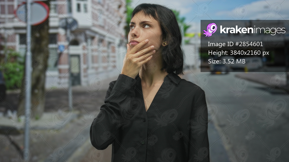 Woman in black shirt points finger to side on street with brick building facade and parked cars; denial.