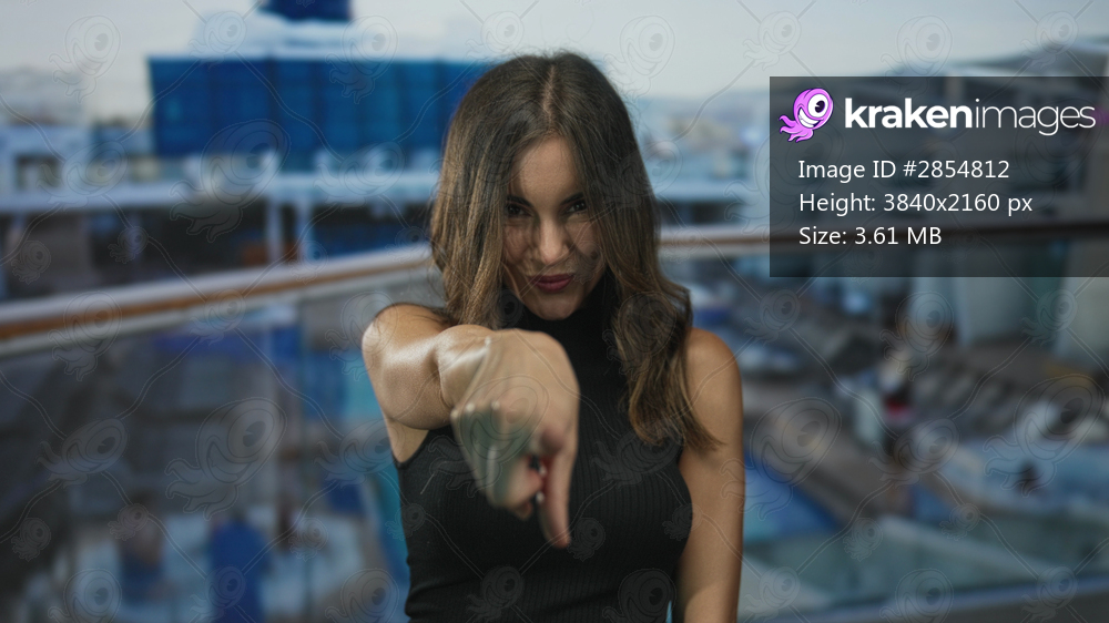 Woman in black sleeveless top flexes arm and points finger forward on boat deck under bright sunlight; confidence.
