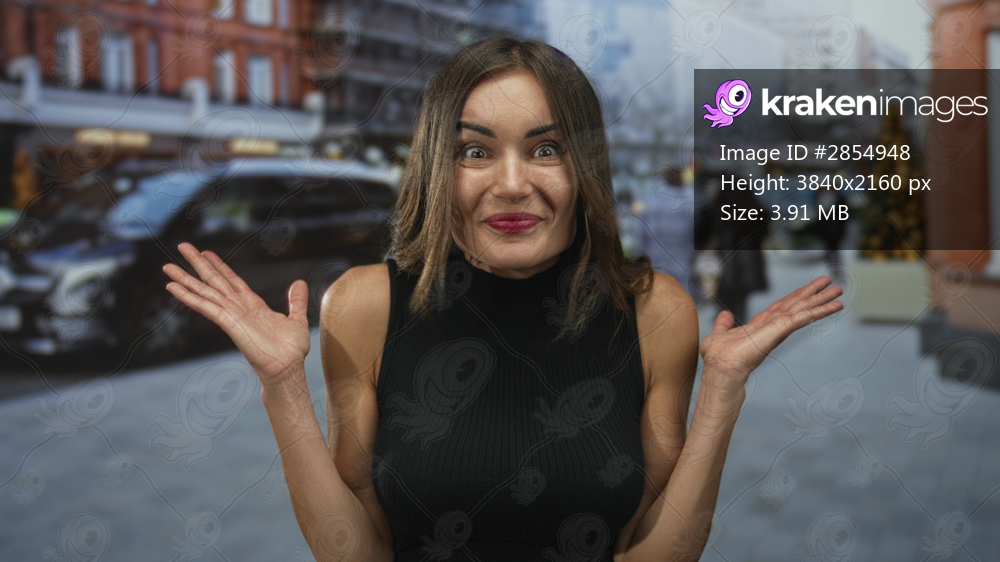 Woman in black sleeveless top with open mouth amid blurred pedestrians on street lined with vehicles and brick buildings; surprise reaction.