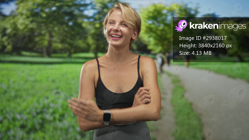 Woman in black sports bra with hands on hips looking down on park path, smartwatch visible; joy recovery.