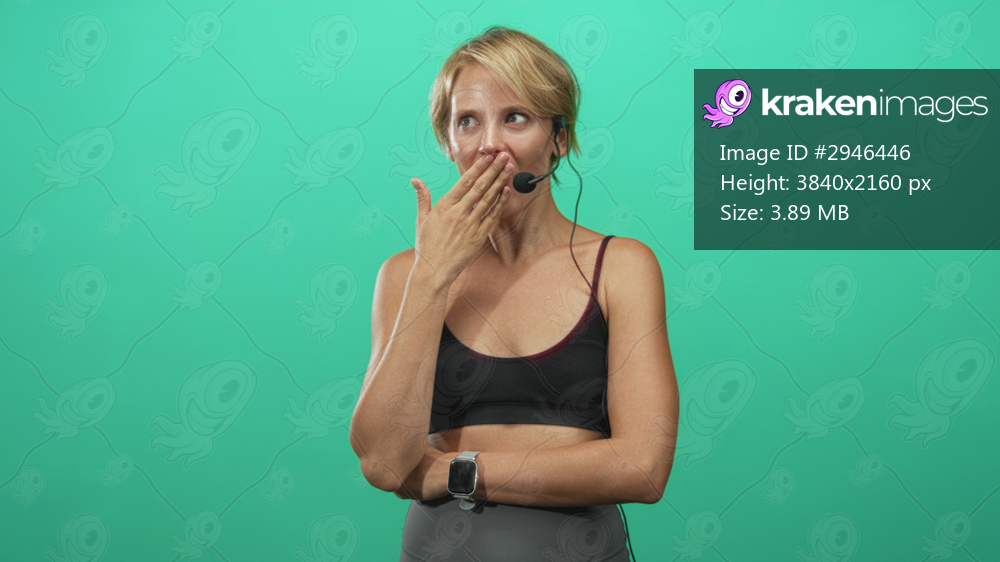 Woman in black sports bra and smartwatch covers mouth with hand while wearing headset in green studio; playful coyness.