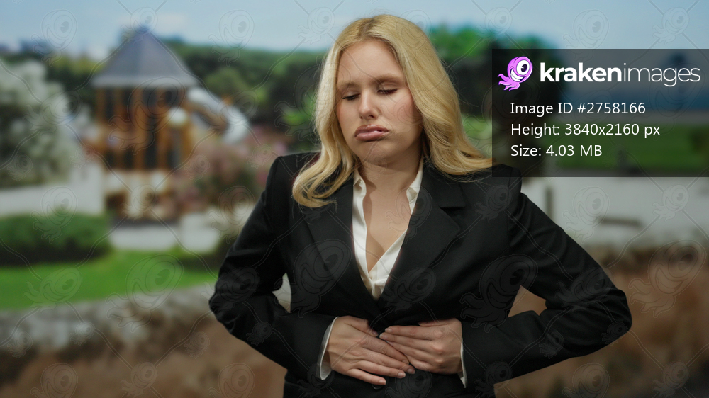 Woman in black suit with blonde hair stands outdoors on a city street looking concerned with hands on stomach against a blurred background of greenery and architecture. - Kraken Images