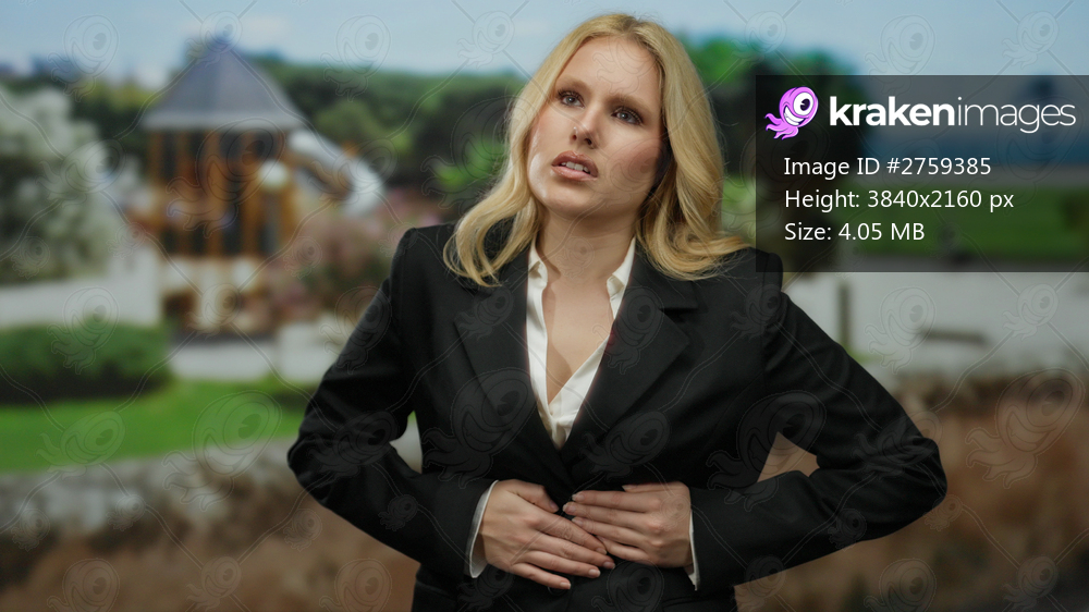 Woman in black suit with blonde hair stands outdoors on a city street looking concerned with hands on stomach against a blurred background of greenery and architecture. - Kraken Images