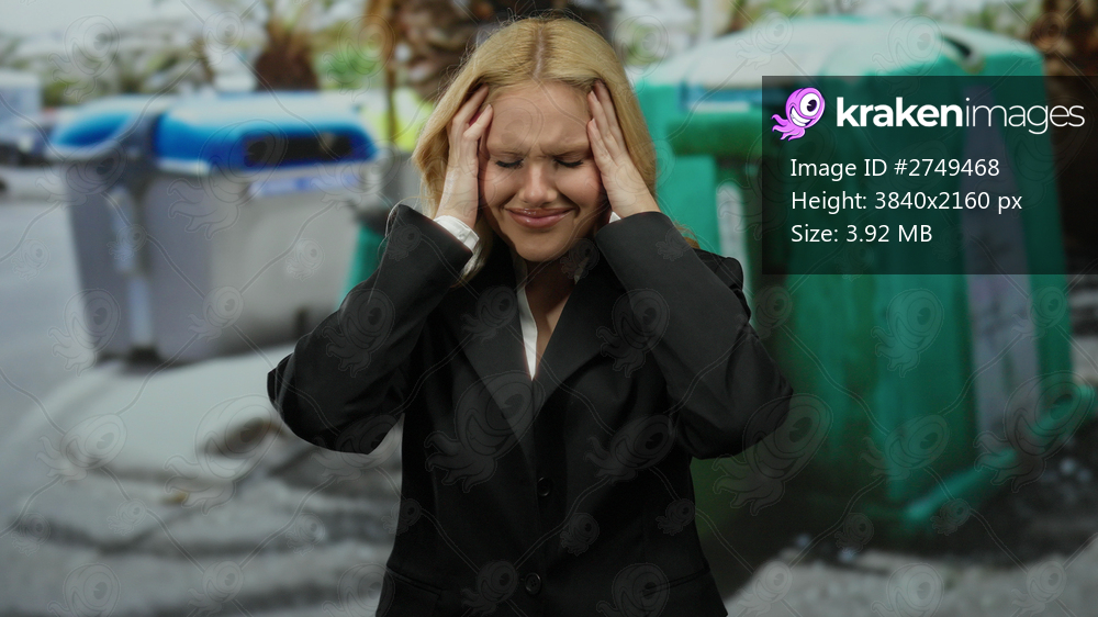 Woman in black suit stands frustrated in urban area near recycling bins, symbolizing environmental awareness and professional stress in a city setting. - Kraken Images