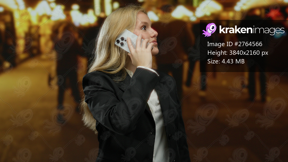 Woman in black suit talking on phone at night market with bright lights and blurred crowd in background, showcasing urban nightlife setting and modern communication - Kraken Images