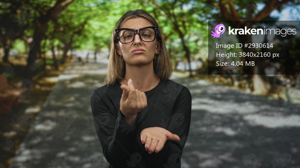 Woman in black sweater points thumbs to chest in sunlit park path while wearing oversized glasses and puzzled expression; self doubt confusion.
