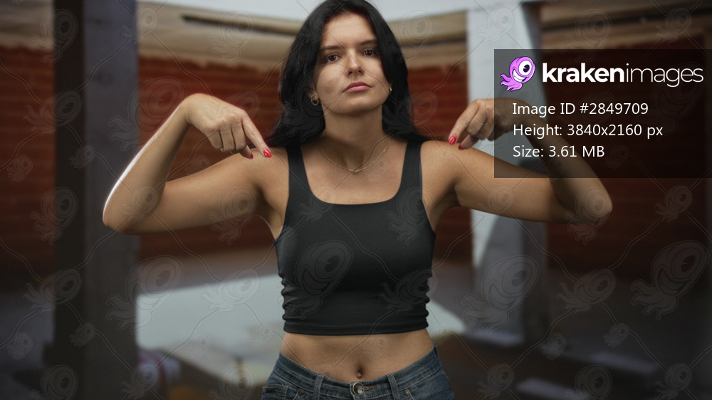 Woman in black tank top points finger downward at exposed stomach in building; steady quiet confidence.