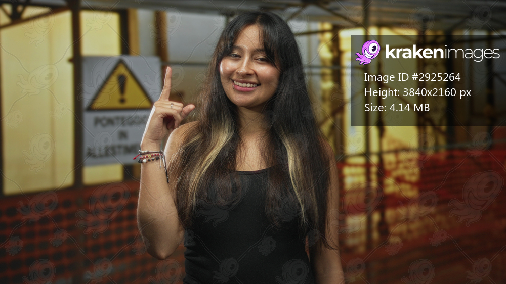Woman in black tank top points index finger up at building construction site scaffolding and safety sign; confidence safety awareness.