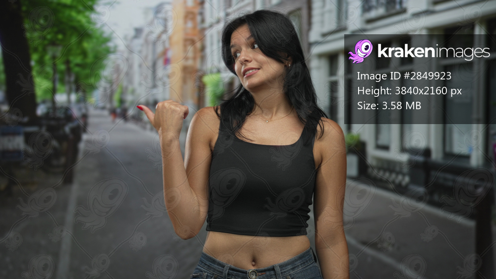 Woman in black tank top shows thumb to the side while standing on street with bare midriff exposed; indifference.