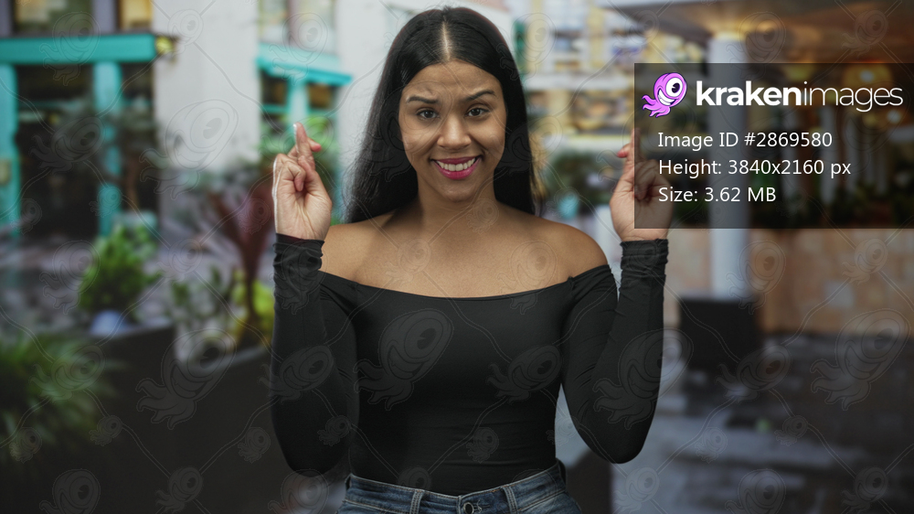 Woman in black top crosses fingers with closed eyes on urban street lined with storefronts and potted plants; hope luck.