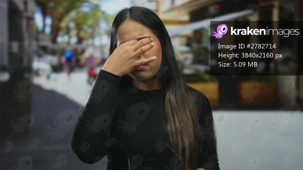 Woman in black top with long hair standing outdoors on a street, appearing thoughtful and concerned as she touches her forehead, blurred background of urban shopping area. - Kraken Images