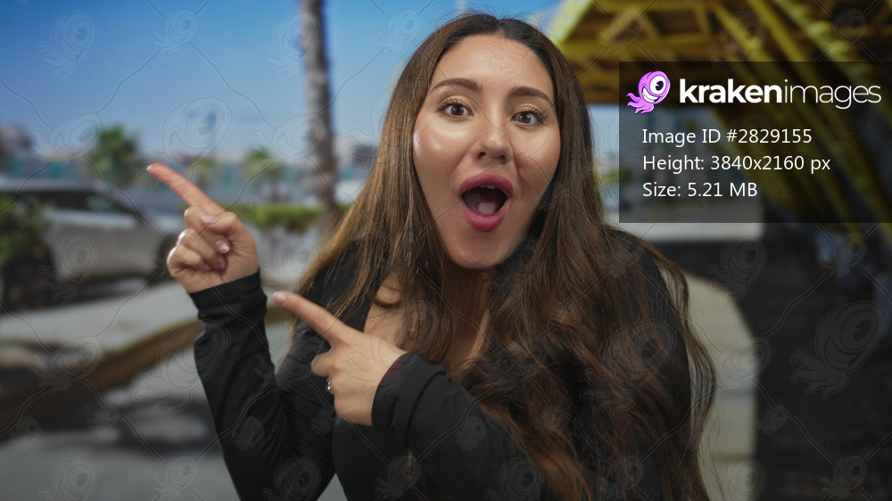 Woman in black top pointing her left finger at right side under yellow scaffolding in street; curiosity.