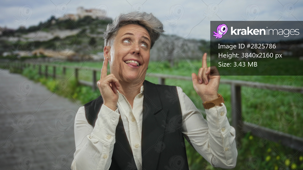 Woman in black vest pointing finger upward on street with green field and hillside building behind; playful wonder.