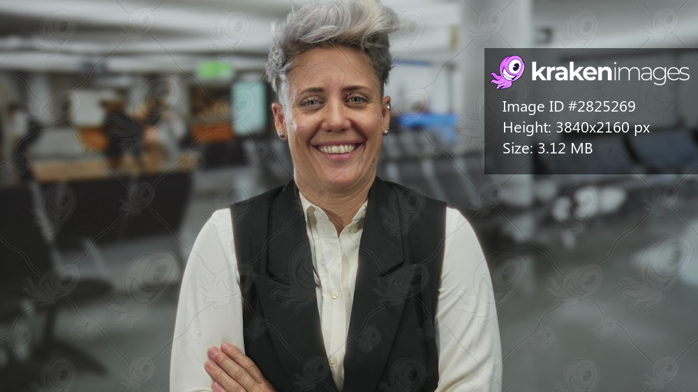Woman in black vest and white blouse crossing her arms near seating area in busy airport terminal; amusement.