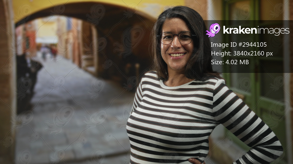 Woman in black and white striped top smiles, hand on hip and hair flipping, glasses visible, posed in a narrow arched cobblestone street; confidence travel leisure. - Kraken Images