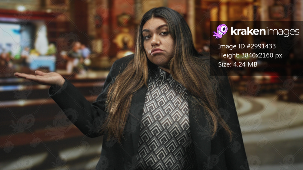 Woman in blazer and patterned top shrugging with palm up and sullen pout amid ornate interior of a historic building; quiet resignation.