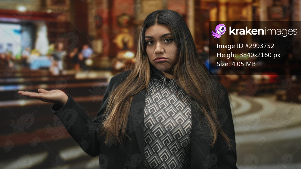 Woman in blazer and patterned top shrugging with palm up and sullen pout amid ornate interior of a historic building; quiet resignation.