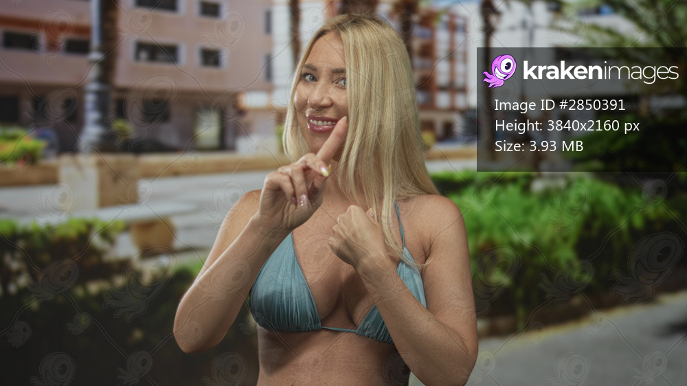 Woman in blue bikini top pointing finger to herself on sunlit street with blurred buildings and greenery in background; denial.