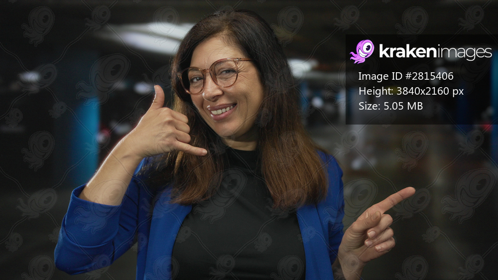 Woman in blue blazer makes call me gesture and points finger in parking garage; playful invitation.