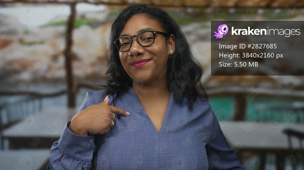 Woman in blue blouse wearing glasses points finger to chest on street during daytime; self confidence.