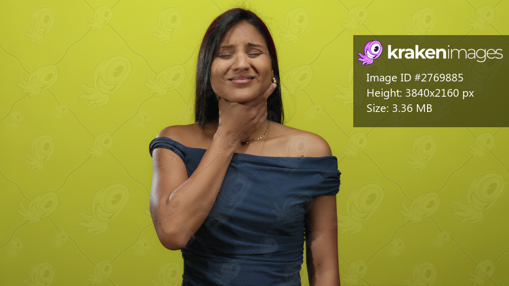 Woman in blue dress looking distressed holding throat against vibrant yellow background displaying emotion and concern