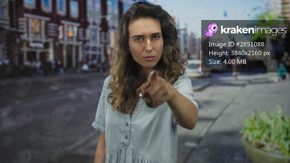 Woman in blue dress pointing finger forward with stern expression on bustling street; defiance confrontation empowerment.