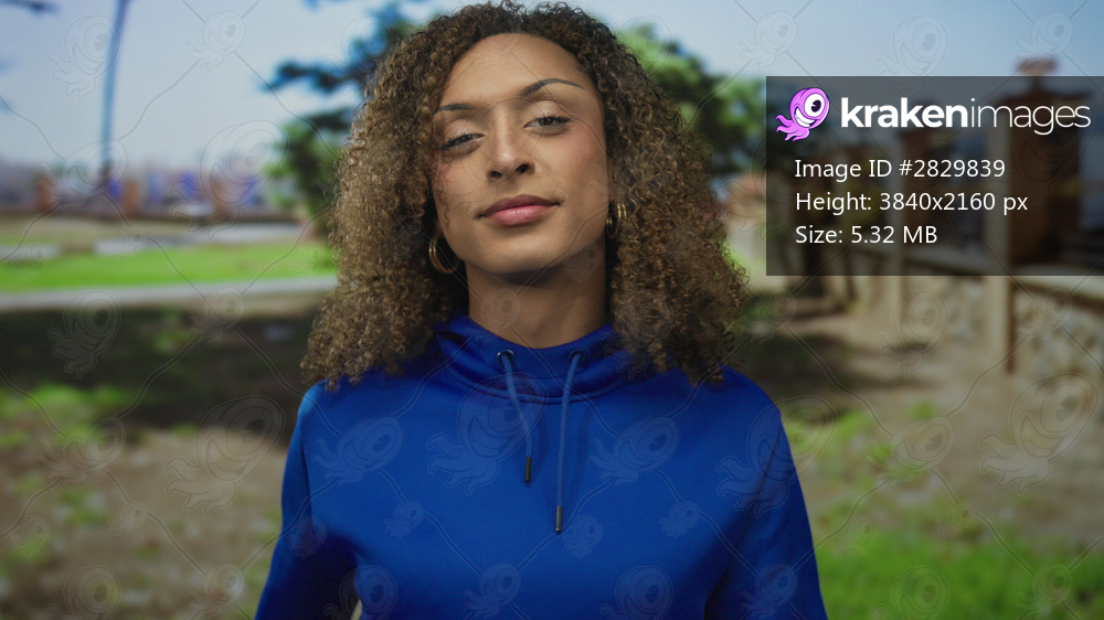 Woman in blue hoodie holds her palms up in street near a wooden railing as she shrugs with a questioning expression; doubt.