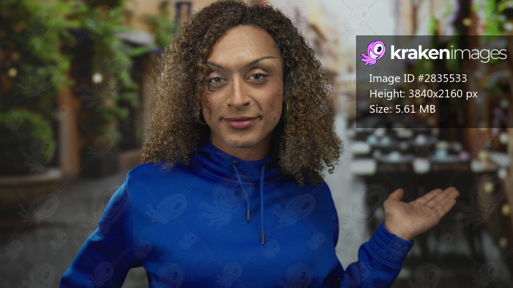 Woman in blue hoodie holds open palm in restaurant interior with tables and chairs behind; confidence.