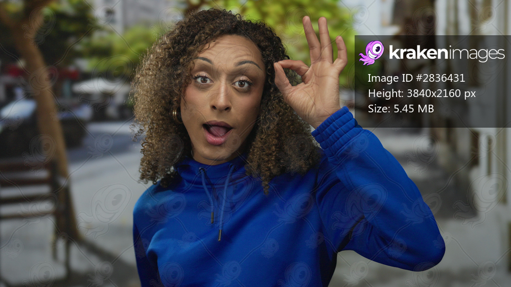 Woman in blue hoodie making ok sign with hand on street; approval positivity confidence empowerment.