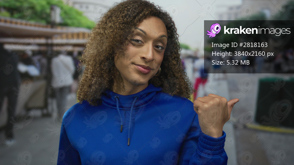 Woman in blue hoodie points thumb toward busy market stall on street while raising eyebrow; confidence.