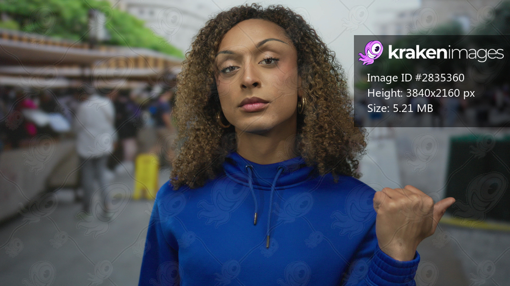 Woman in blue hoodie points thumb toward busy market stall on street while raising eyebrow; confidence.