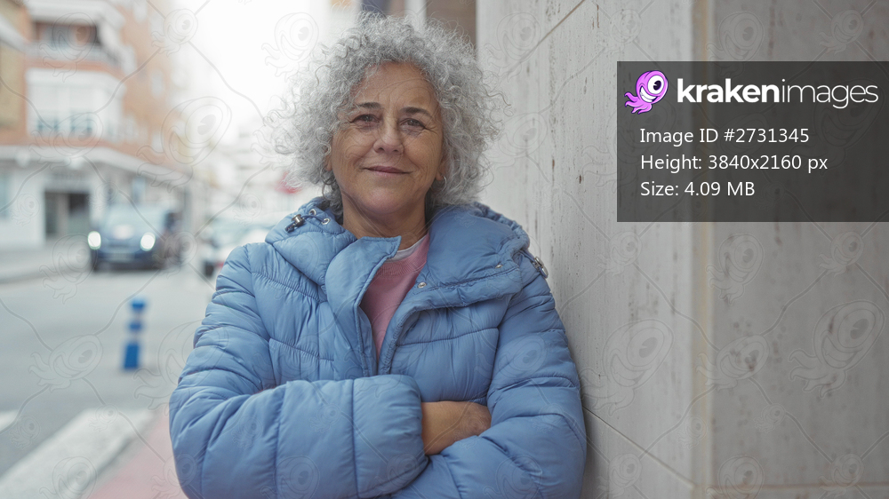 Woman in blue jacket with crossed arms standing on urban street with grey hair smiling on a city road with cars and buildings.