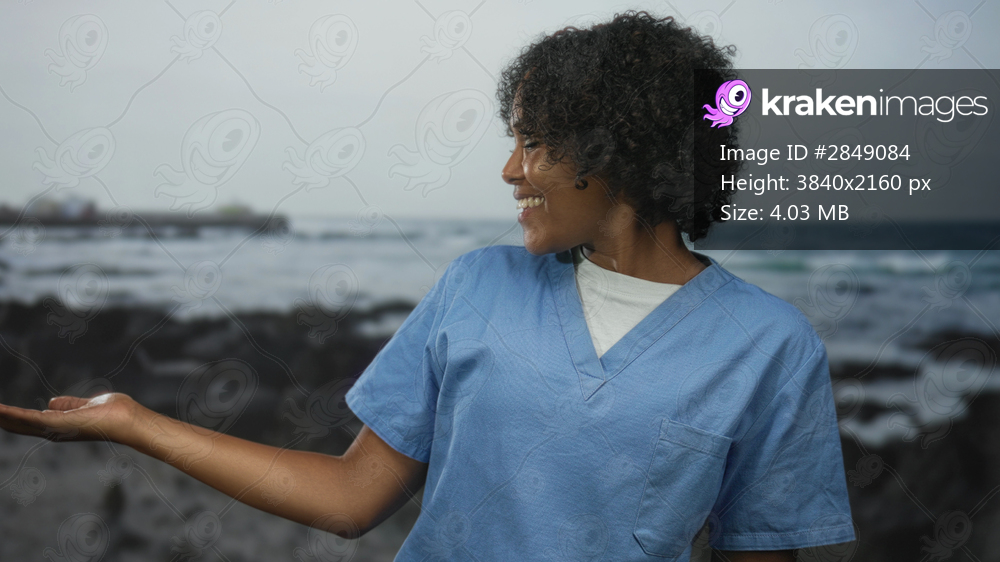 Woman in blue scrub top holds out arm on sandy beach as waves break and she smiles warmly under bright light; joy.