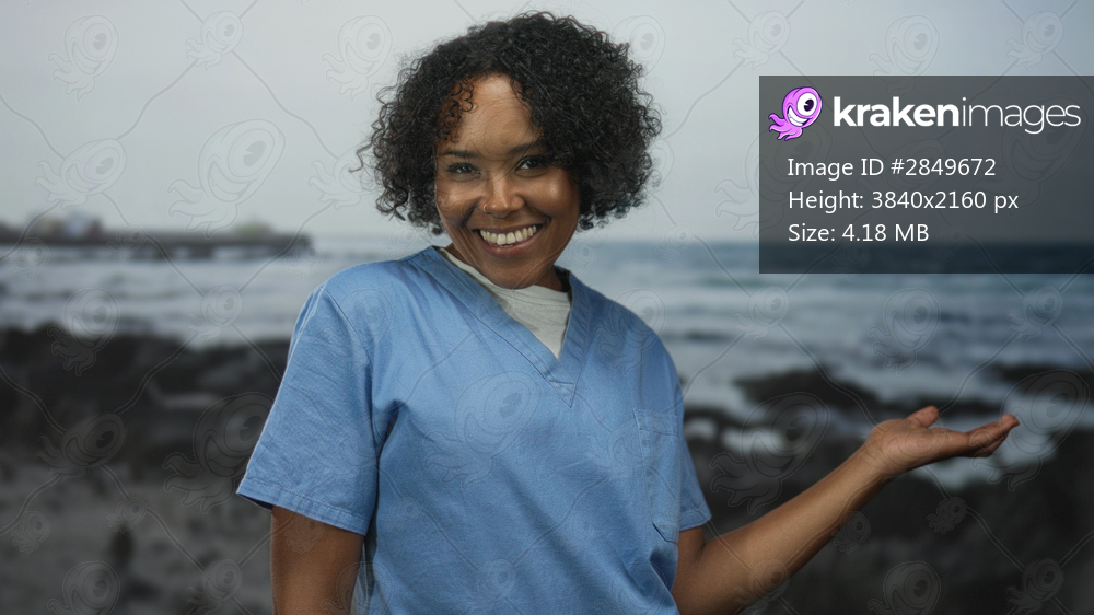 Woman in blue scrub top holds out arm on sandy beach as waves break and she smiles warmly under bright light; joy.