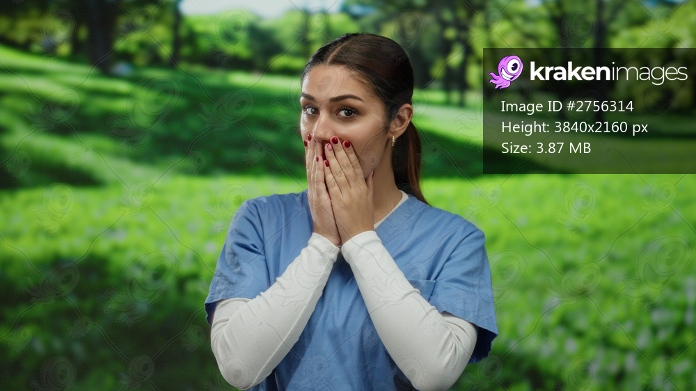 Woman in blue scrubs covers mouth in surprise at park with lush greenery, standing outdoors, showcasing a nurse or doctor in an unexpected moment.