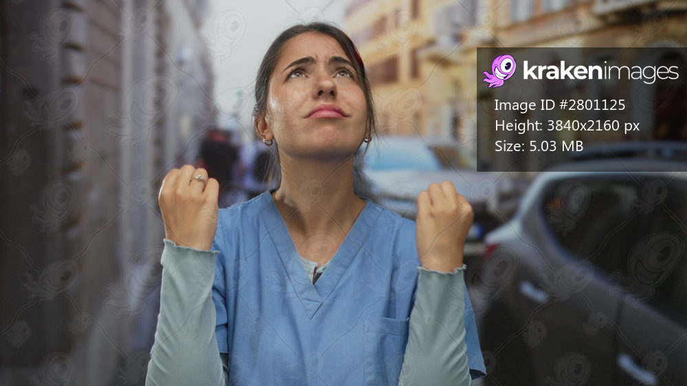 Woman in blue scrubs outdoors on street expressing frustration with blurred urban background and vehicles visible.
