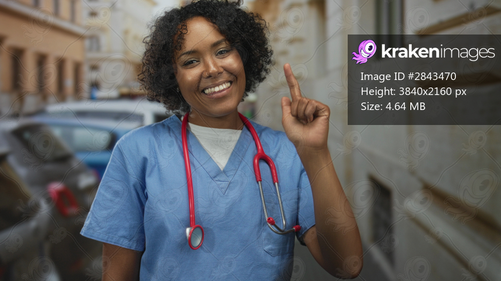 Woman in blue scrubs with red stethoscope smiling and counting fingers on her right hand in a city street; optimism confidence growth.