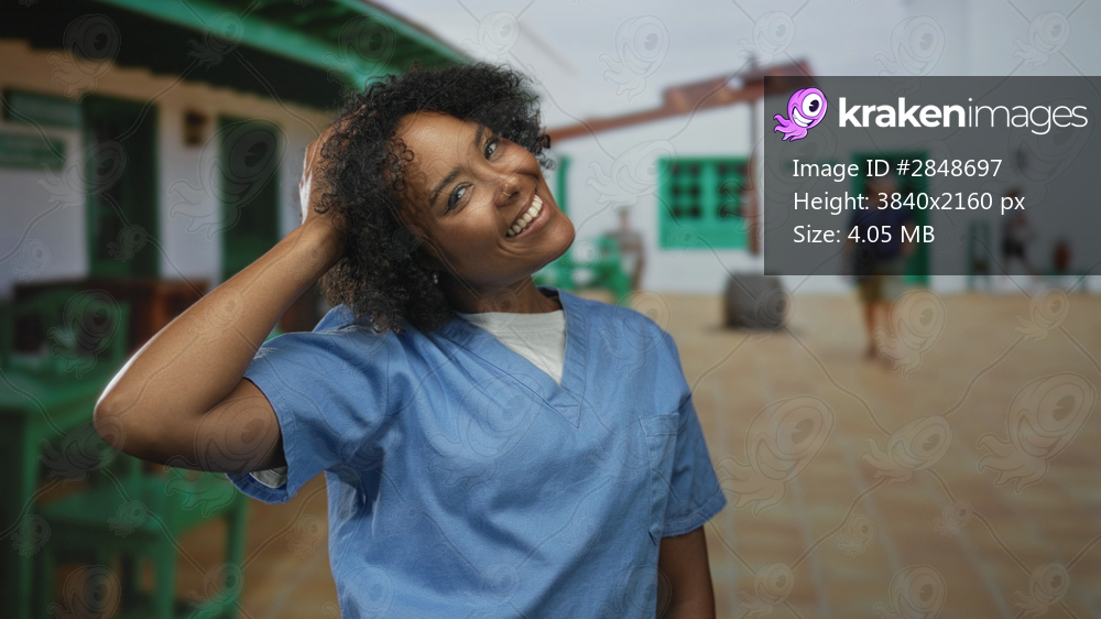Woman in blue scrubs touches curly hair by green door at home entrance under bright sunlight; happiness.