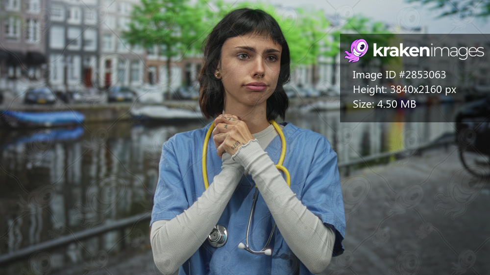 Woman in blue scrubs with yellow stethoscope stands holding clasped hands near chest on street; anxiety.