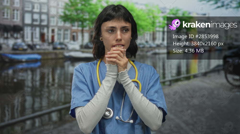 Woman in blue scrubs with yellow stethoscope stands holding clasped hands near chest on street; anxiety.