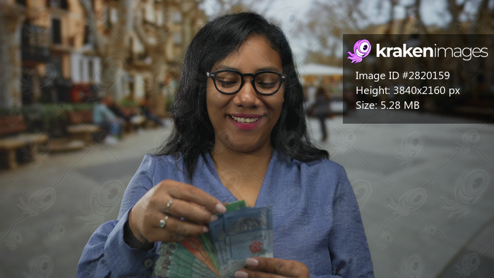 Woman in blue shirt counts colorful ringgit bills with bare hands on busy city street; prosperity.
